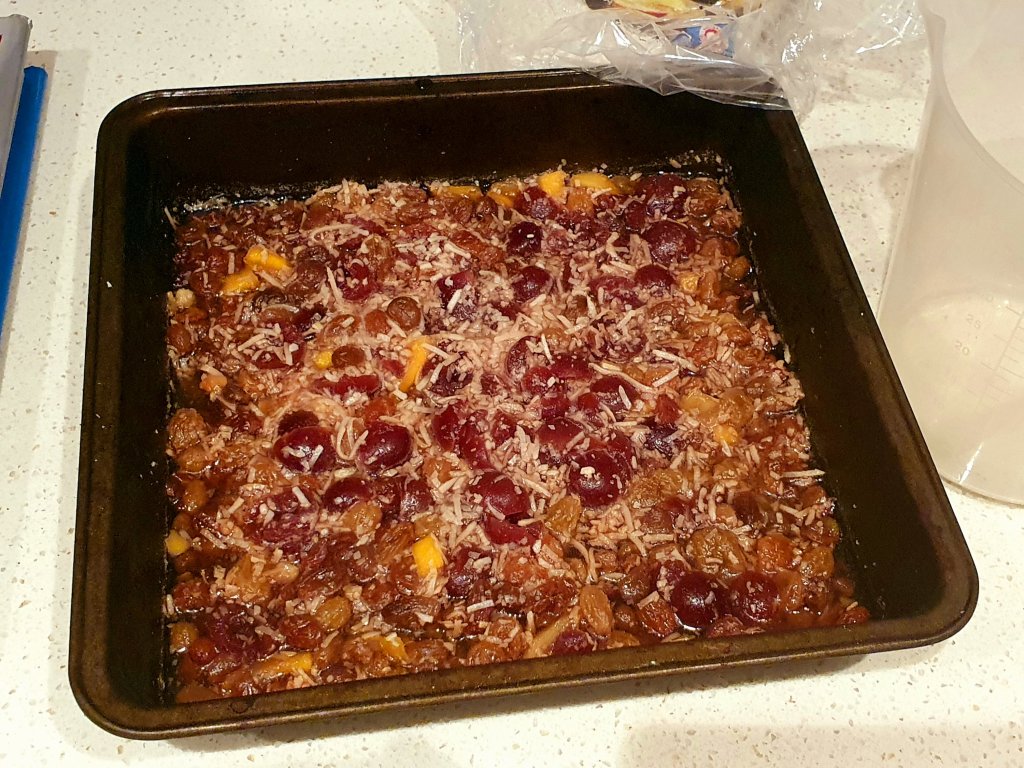 - Grease a rectangular or square baking pan. Put fruit into a tray and cover with the hot brewed Earl Gray or fruit tea. Allow to soak for four hours or overnight.
