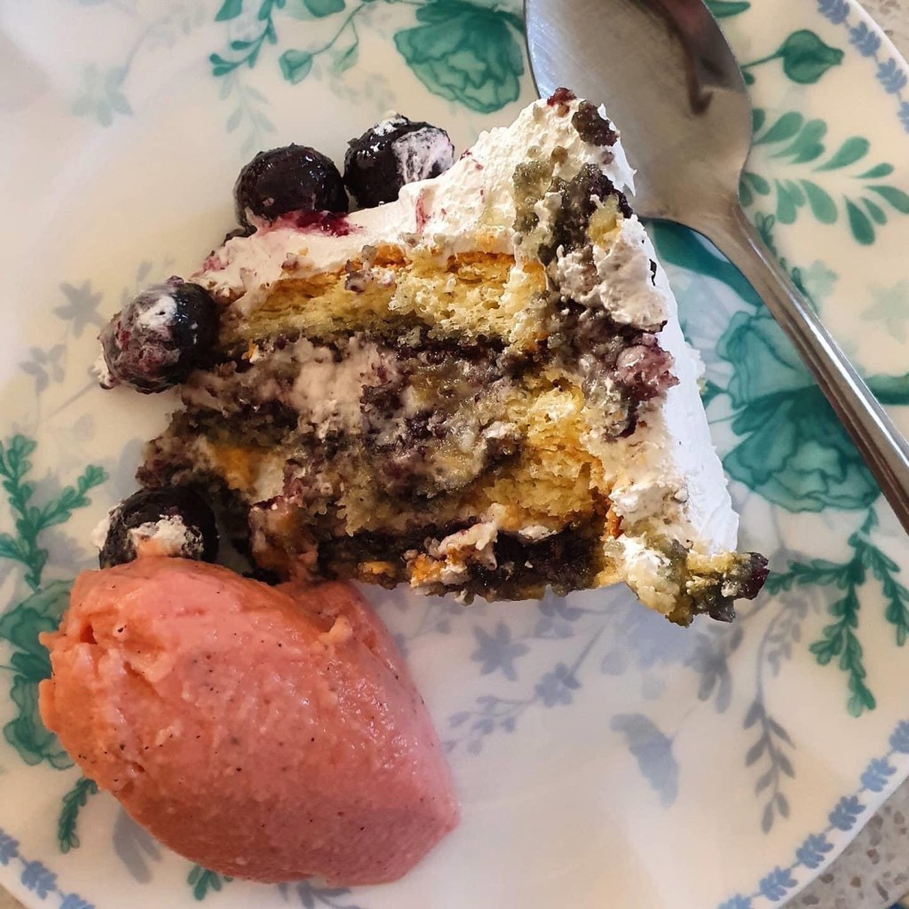 Dad, on the other hand, isn’t much of a fan of the tartness of fresh blueberries, so I had to think of a way to bring out their natural sweetness to enhance this cake. I remembered a gift I’d bought my mum from near where I live, The Grounds of Alexandria – Blueberry and Violet jam. It’d be the perfect ingredient to tie this all together and bring harmony to their often very different tastes. I used the jam between the layers, and also some warmed with the handful of frozen blueberries used on top of the cake finished cake.