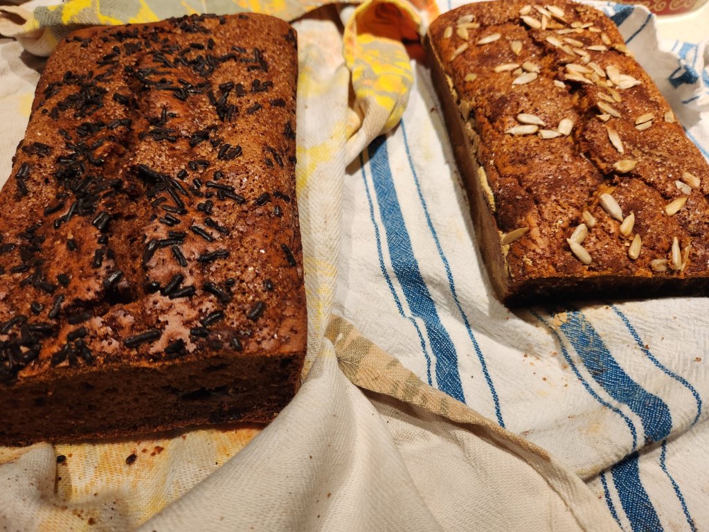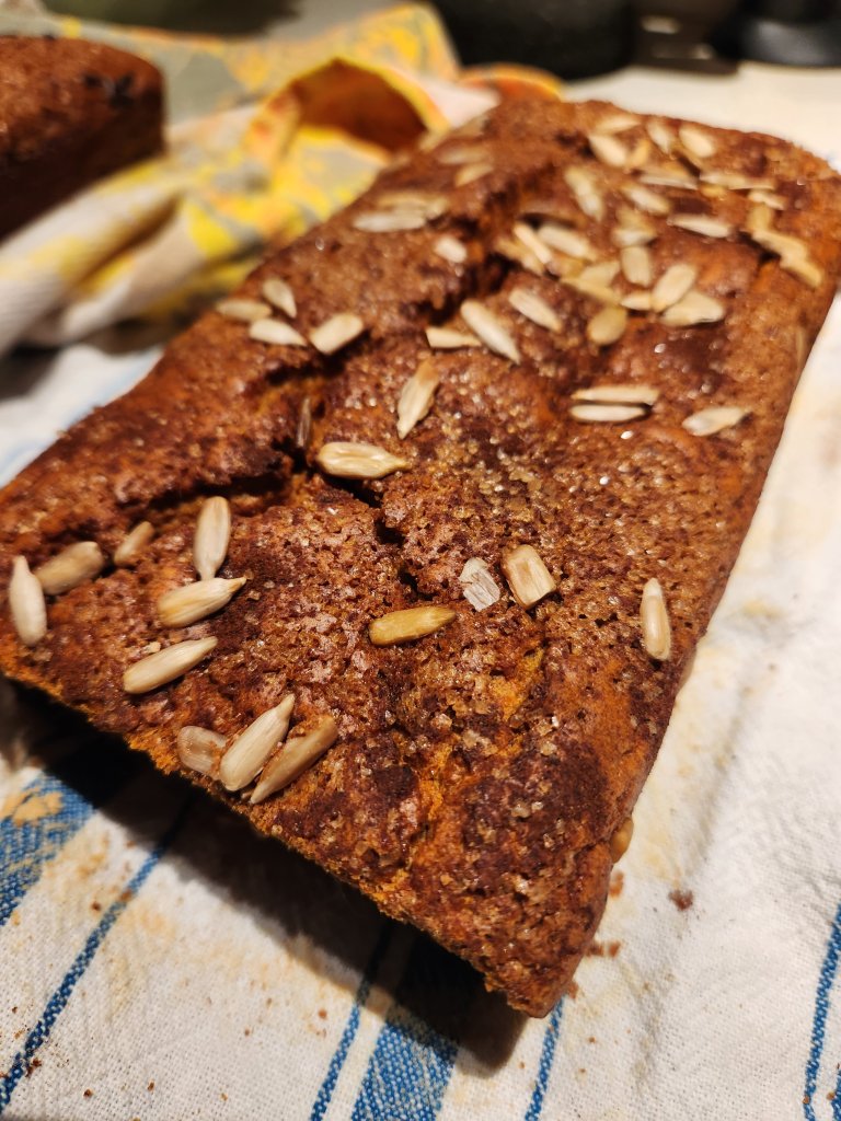 - Sprinkle top of loaves with: dried pumpkin seeds, all-spice, cinnamon, and some coarse sugar crystals (or any combination with the sugar)
